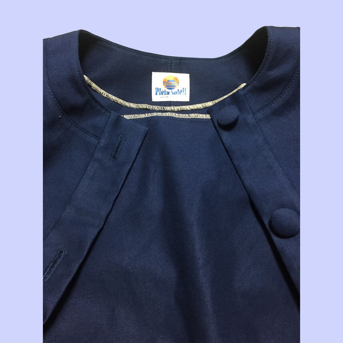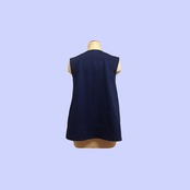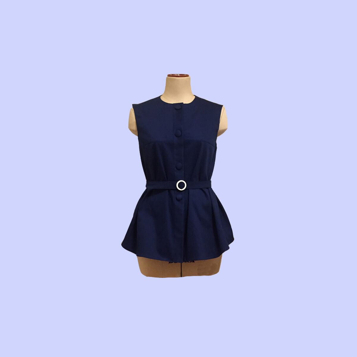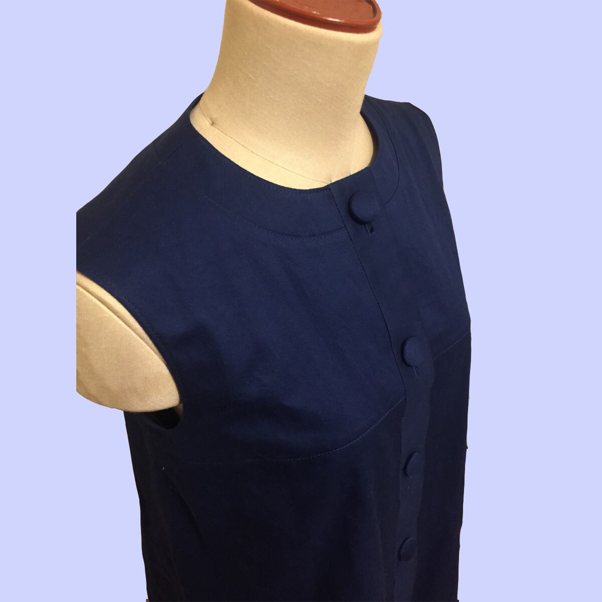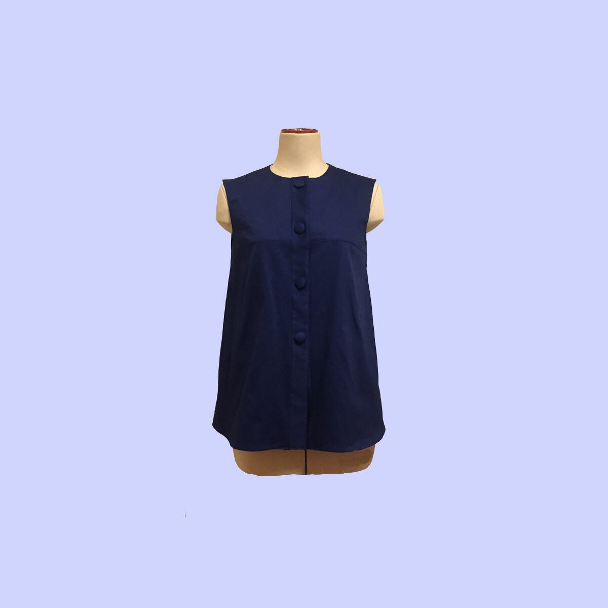 ノーカラー、ノースリーブ、くるみボタンが60sチックなデザインのレトロブラウスです。